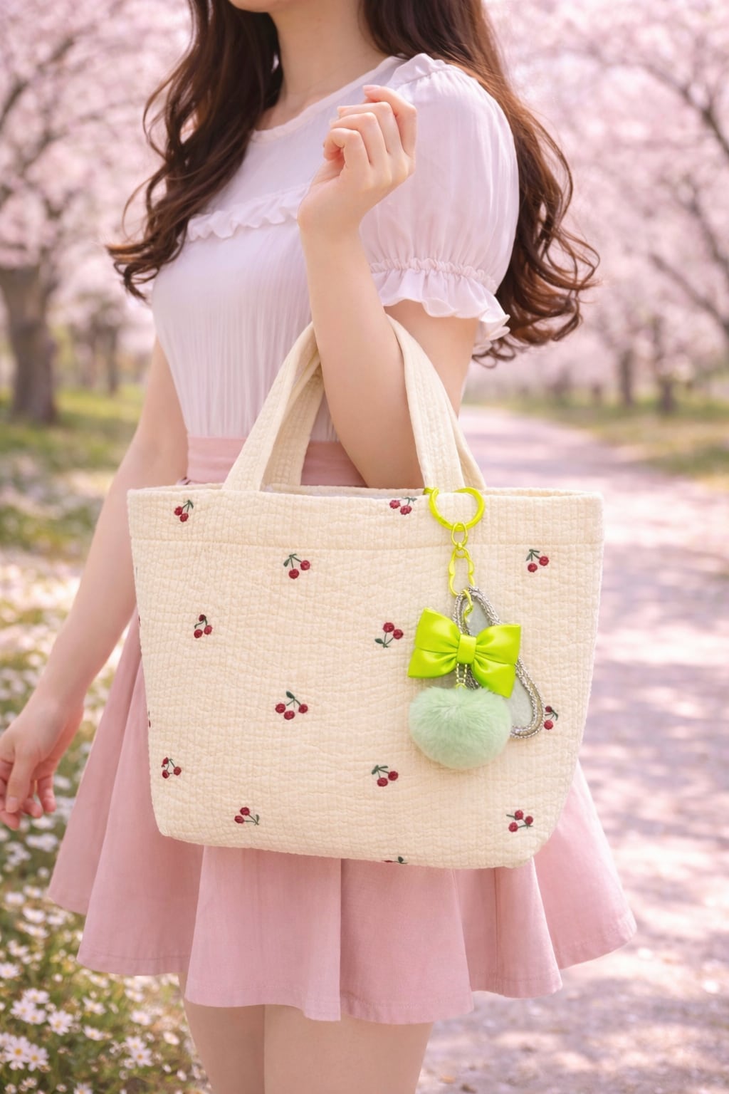 かわいらしいさくらんぼの刺繍が施されたこのヌビバックは、日常使いはもちろん、特別なシーンでも幅広く活躍するアイテムです。デートやお出かけ、友人とのランチ、ママバックやお稽古バックなど、さまざまな場面であなたの魅力を引き立てます!