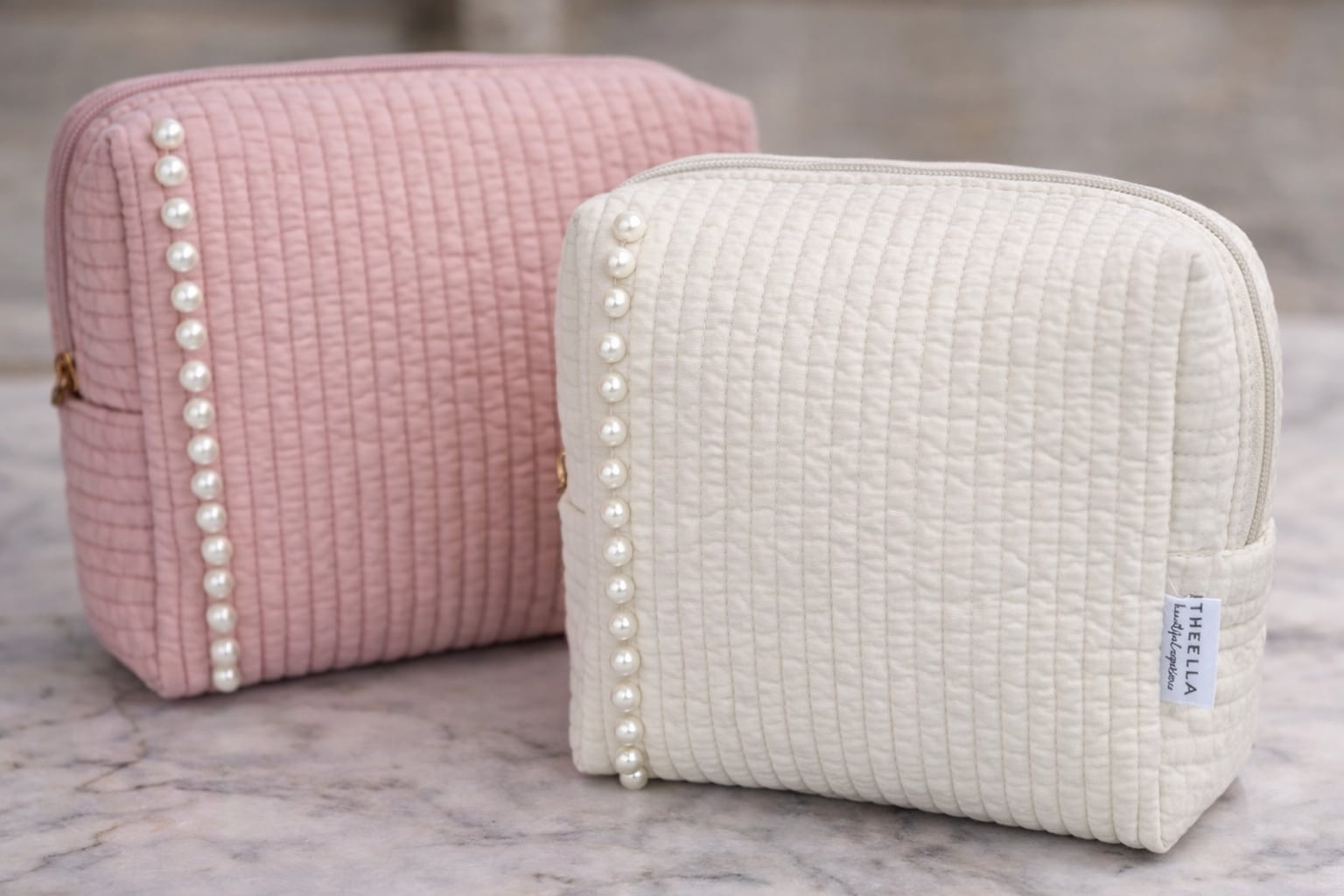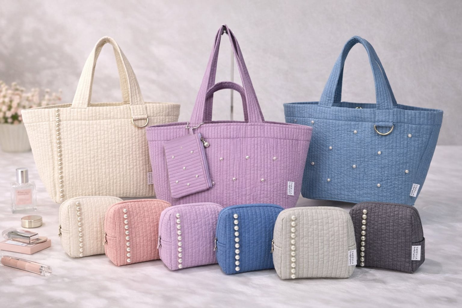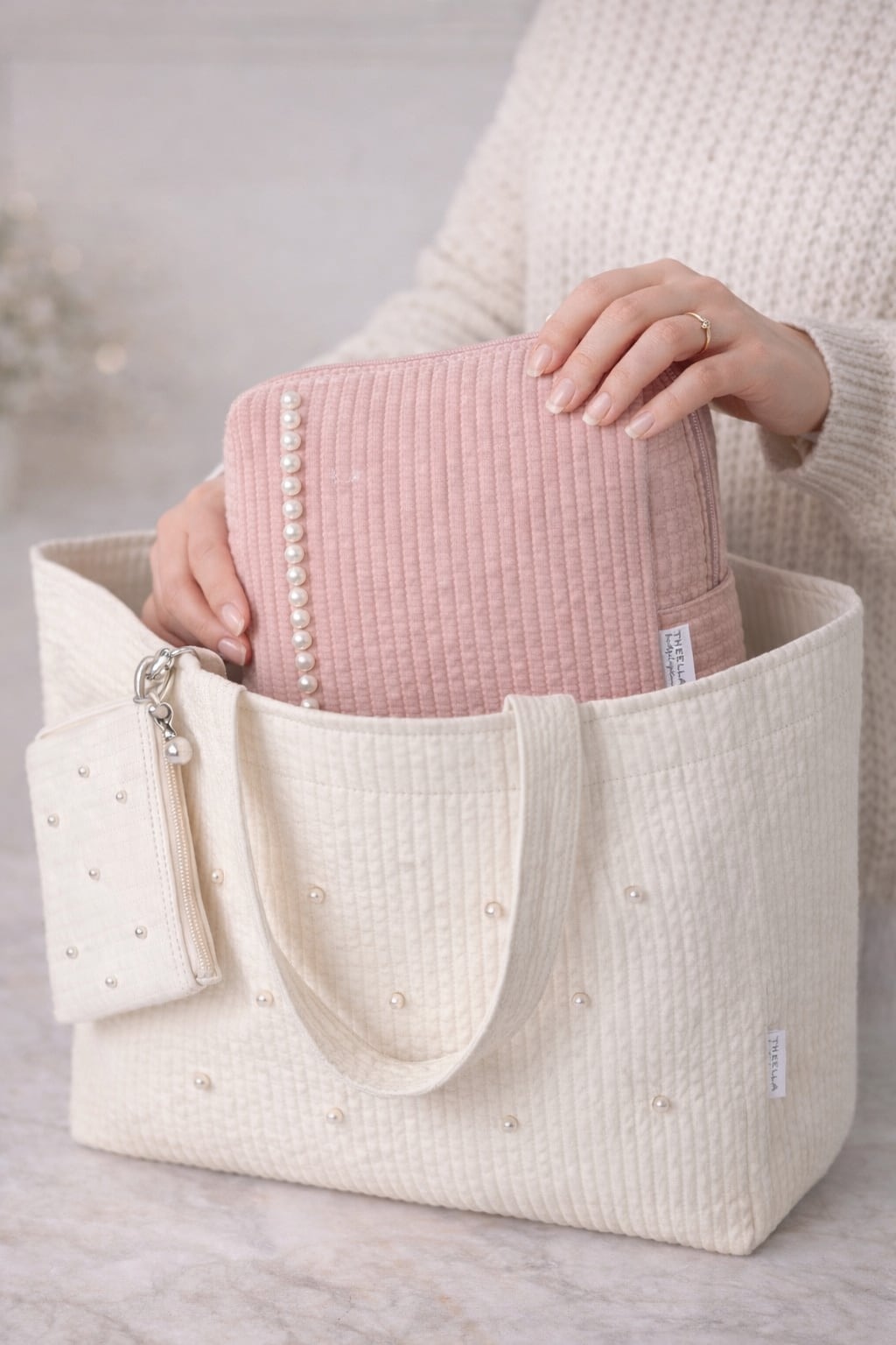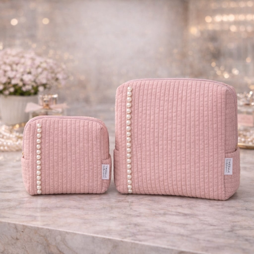 端正に並ぶパールが印象的な、上質なキルティングポーチ。